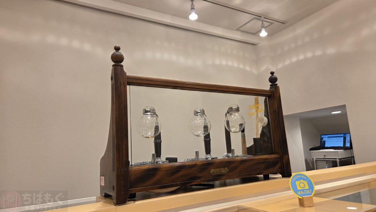 本格的なサイフォンで淹れる珈琲を、上品なカップで飲みます。