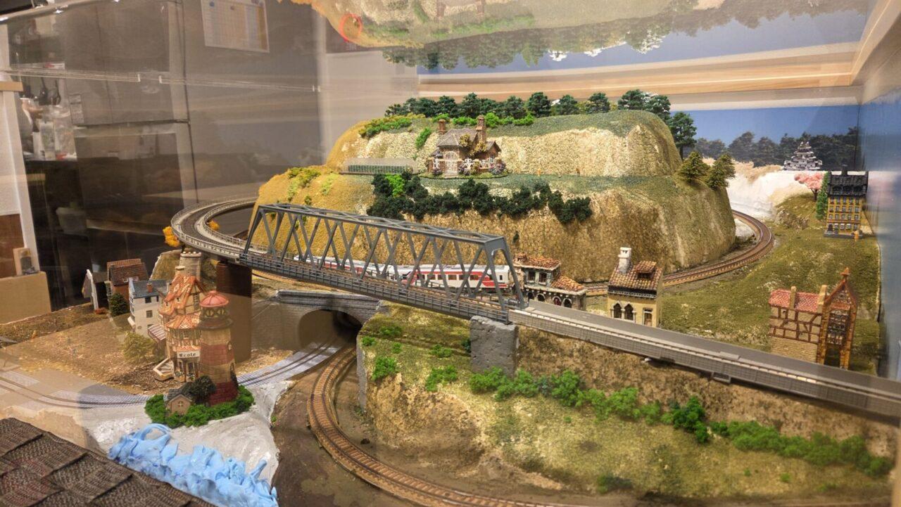 ・店内では、様々な列車が巨大ジオラマの中を走っている。