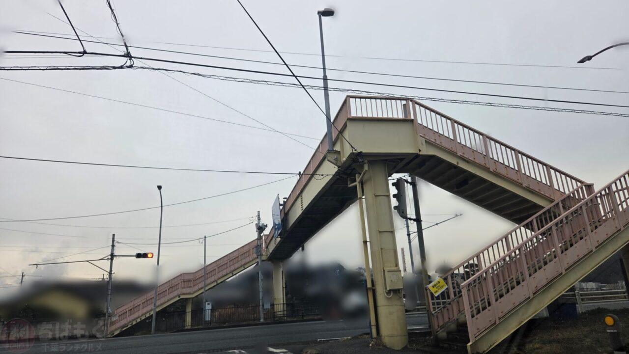 ステーキけんさんの近くの、この歩道橋のすぐ横にアグリぱぁくさんに繋がる細い道があります。