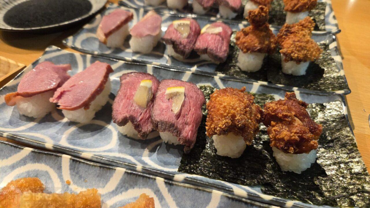 ・肉寿司三種6貫盛り(牛テール・鴨・唐揚げ・豚バラ)