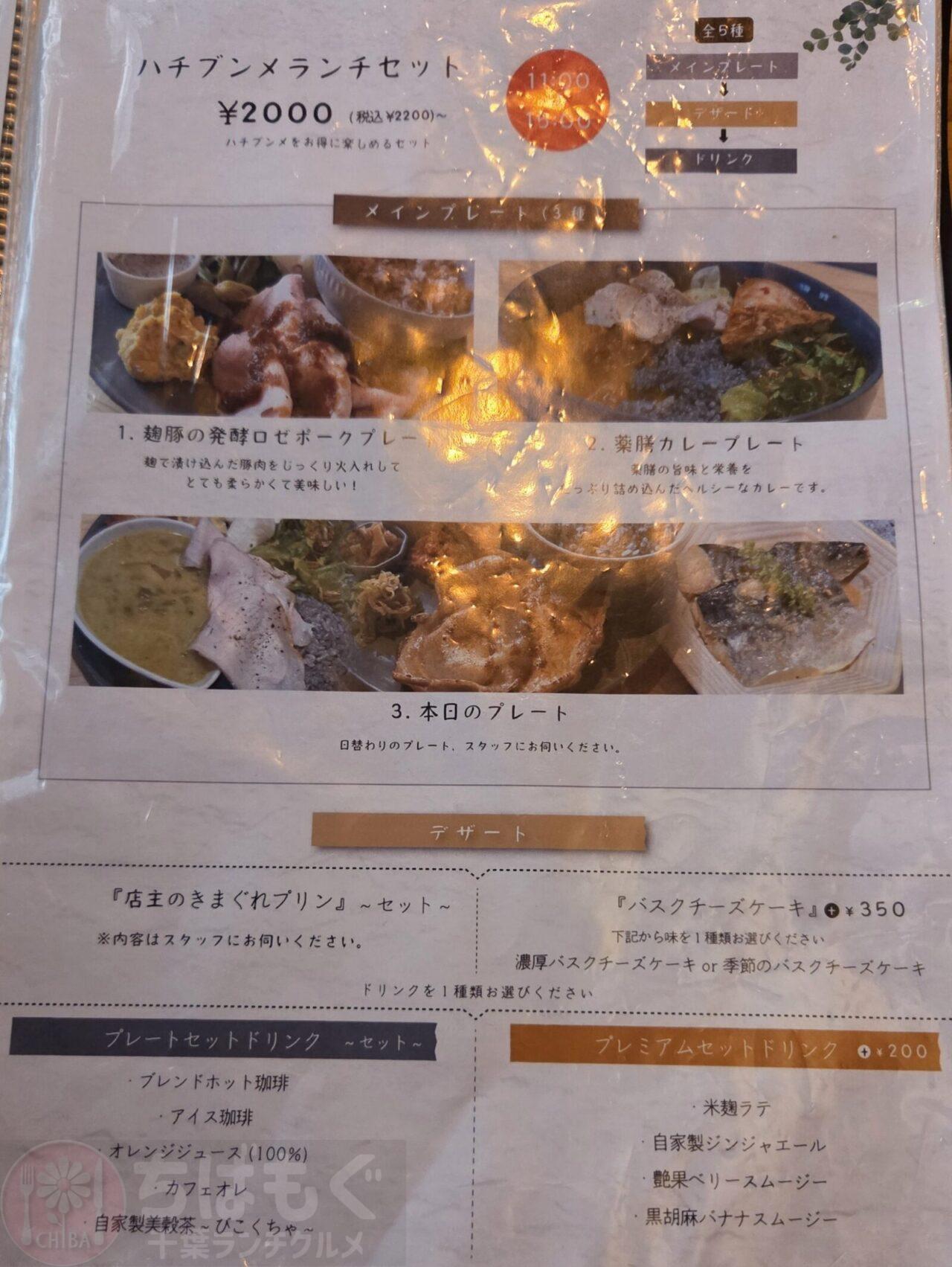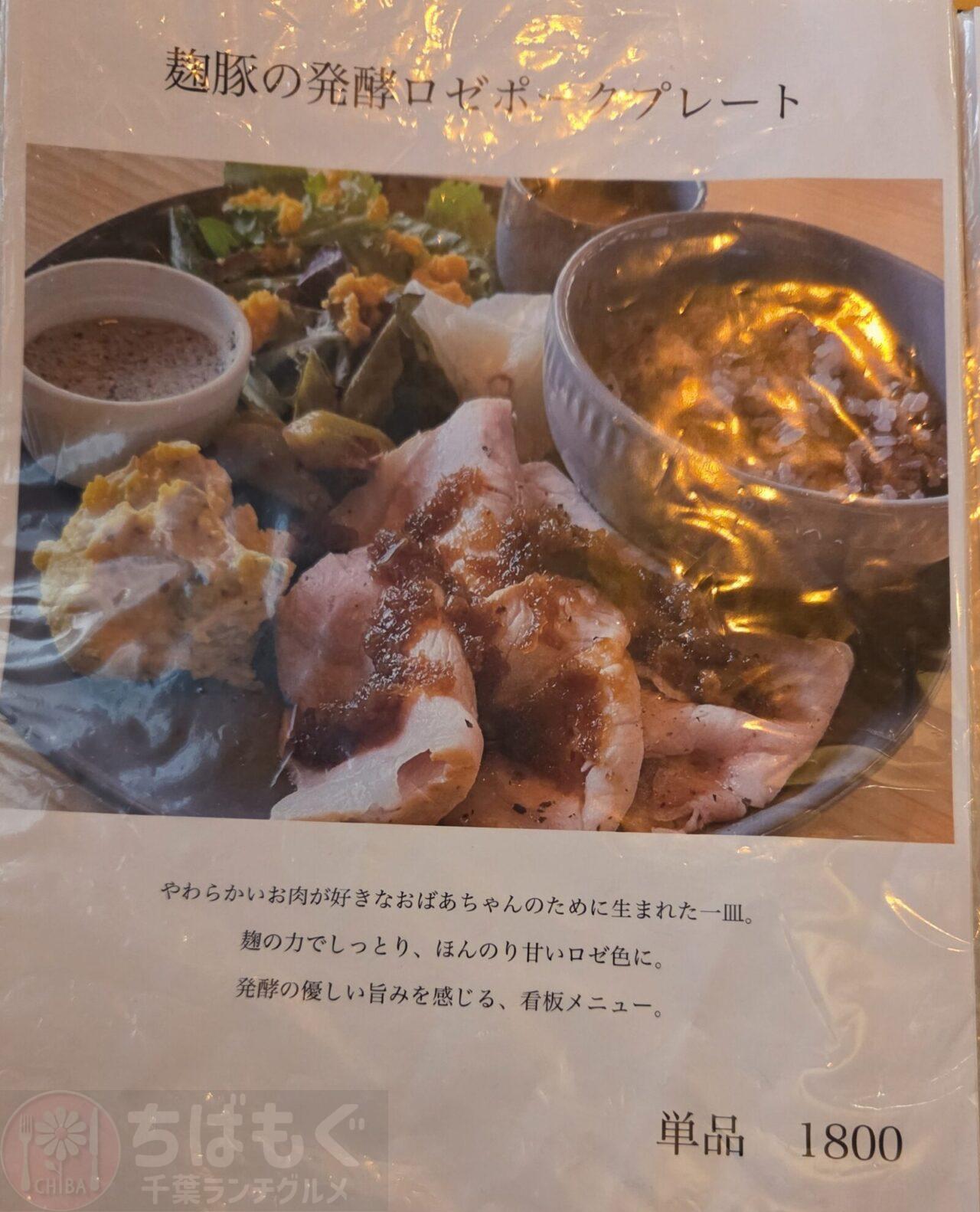 ・看板メニューの麴を使ったローストポークプレートや、小麦粉・白砂糖不使用のバスクチーズケーキなどがある。
