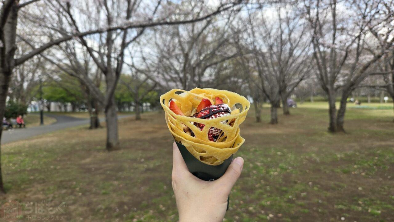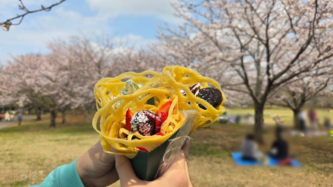 ワンちゃんと楽しめる、ケーキのような花形クレープがあると知り、お花見スポット北総花の丘公園(印西)にやってきました。